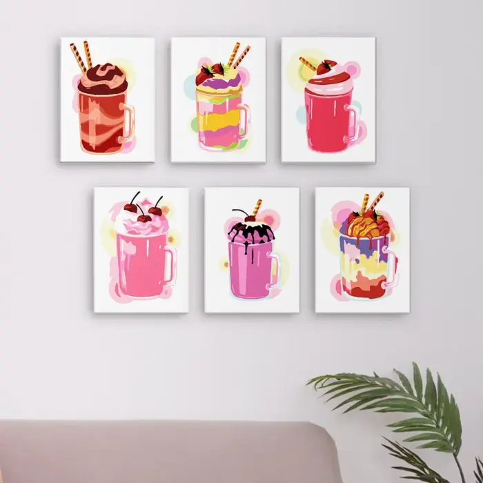 Le kit “Shakes Exotiques” Mini Peinture par Numéros apporte un rafraîchissement tropical et des couleurs créatives à votre toile. Que ce soit mangue, ananas ou fruit du dragon – les verres imaginatifs remplis d’ingrédients frais créent une joyeuse sensation estivale. Idéal pour les pauses créatives, les décorations de cuisine colorées ou comme idée cadeau. Avec une mini toile pré-imprimée, des peintures acryliques lumineuses et un pinceau, vous pouvez rapidement créer une petite œuvre d’art pleine de saveur et de couleur.